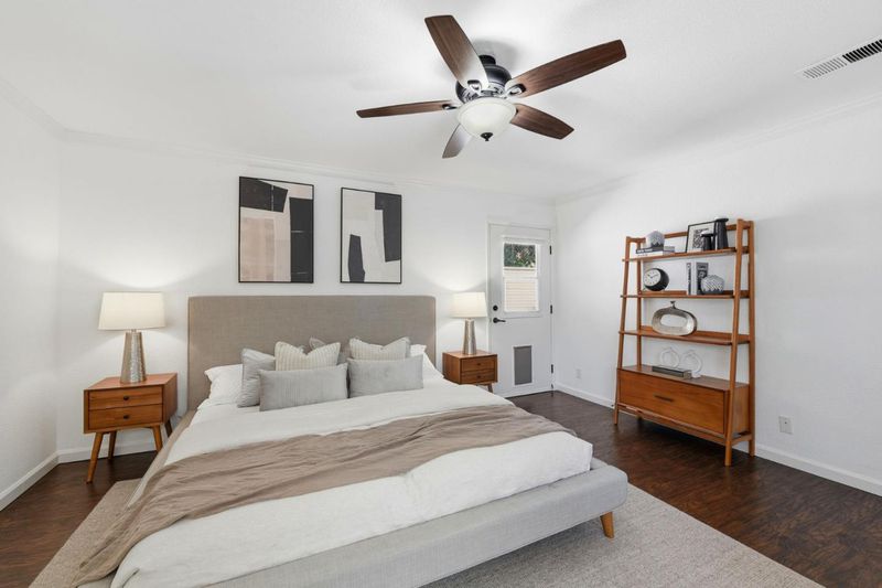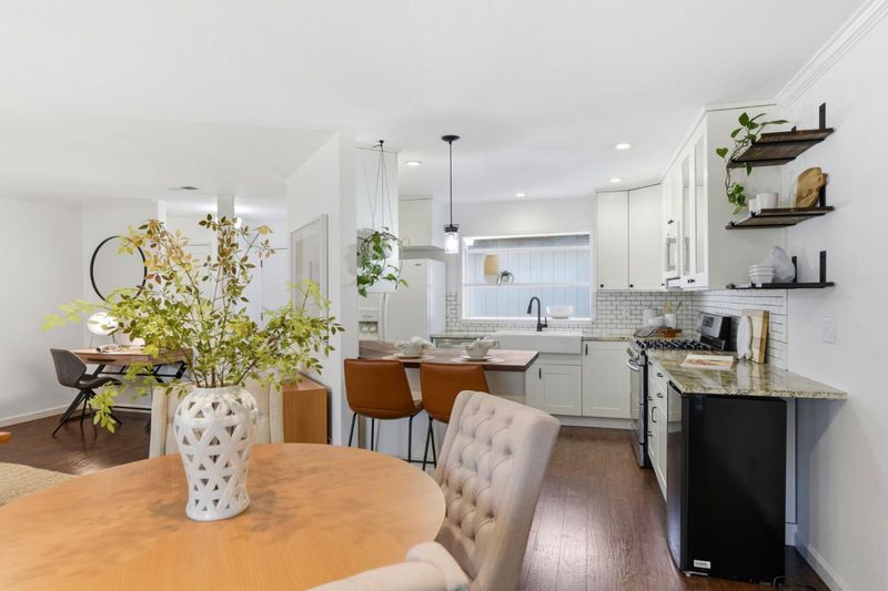 Rare single level end-unit residence that lives like a private single-family home, featuring only one shared wall at the oversized two-car garage and three separate yard spaces that create exceptional privacy and indoor/outdoor flexibility. With no interior steps and an expansive layout, the home feels open, refined, and filled with natural light.Thoughtfully renovated and move in ready, the interior showcases dual-pane windows, a newer high efficiency electric heat pump w AC. Shimmering glasss in the updated bathrooms and new light fixtures throughout the home. Master has a walk in closet and large shower. The bright open-concept kitchen offers granite counters and wood breakfast bar w newer appliances, wine refrigerator and seamless flow into the spacious living and dining areas, ideal for both everyday living and entertaining. Washer and dryer in unit. The desirable end-unit location provides added privacy within a well maintained community featuring a pool and landscaped grounds, all with convenient access to shopping, dining, and major commuter routes. A rare opportunity to enjoy low maintenance living without compromising comfort, space, or style.