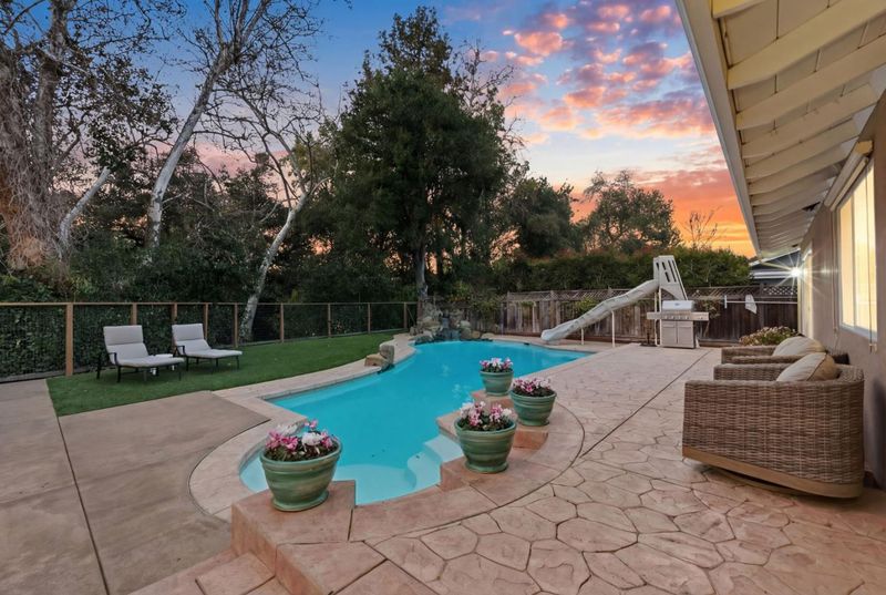 Discover this exceptional Saratoga home offering 6 bedrooms and 4 bathrooms, with a rare blend of refined elegance, and resort style living in one of Saratoga's most sought after neighborhoods. The home immediately impresses with a spacious and smart floor plan designed for elevated living and spectacular entertaining. The chefs kitchen is the heart of the home, featuring superior appliances and generous space for gathering and hosting memorable occasions. A dedicated media room exudes a versatile space for immersive sporting events, streaming parties, Peloton workouts, or relaxed evenings at home. The primary suite is a luxurious retreat, with a spa design that delivers tranquility, and a sense of escape at the end of the day. The guest bedrooms offer flexibility for family living, hosting friends and work from home options. An abundant backyard is a private resort, featuring an in ground pool and hot tub, custom decking, a bocce ball court, fire pit & a curated herb garden. Mature landscaping surrounds the property, creating a peaceful, private setting ideal for seamless indoor outdoor living. Ideally situated near top rated schools, fine dining, boutique shopping, and all that Saratoga has to offer, this remarkable home delivers an exceptional lifestyle in a premier location.