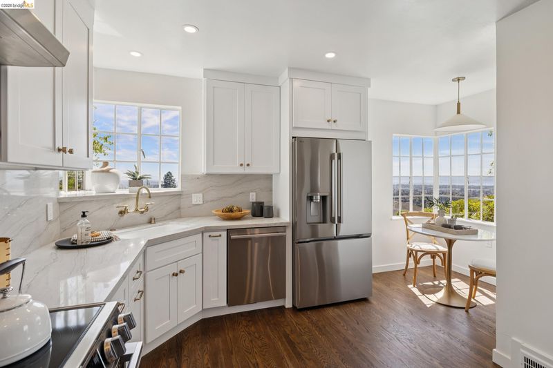 This enchanting storybook traditional, commands sweeping San Francisco Bay views that unfold like a living painting, light, water, and skyline in constant motion. A compelling blend of timeless character and just-completed updates, the home pairs classic architecture with effortless livability. The main level features a striking living room with wood-hewn beams and rustic wood burning fireplace, a striking dining room oriented to capture the mesmerizing views, and a perfectly placed bedroom and full bath. Interior access to the attached two-car garage adds everyday ease. The newly renovated eat-in kitchen is a true centerpiece, with crisp new cabinetry, updated countertops, a new state-of-the-art induction range, and elevated designer finishes, overlooking a sunlit, level lawn, ideal for play or relaxation. Upstairs features three spacious bedrooms and two beautifully updated baths, with two bedrooms featuring versatile adjoining spaces and a primary set apart for a quiet retreat. A truly special offering, moments from Piedmont’s renowned schools, parks, and the soon-to-open community pool.