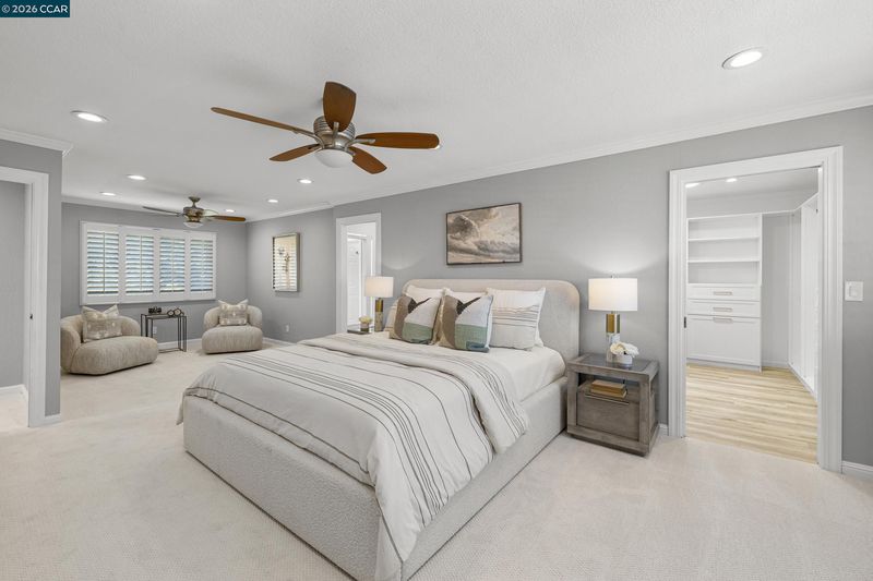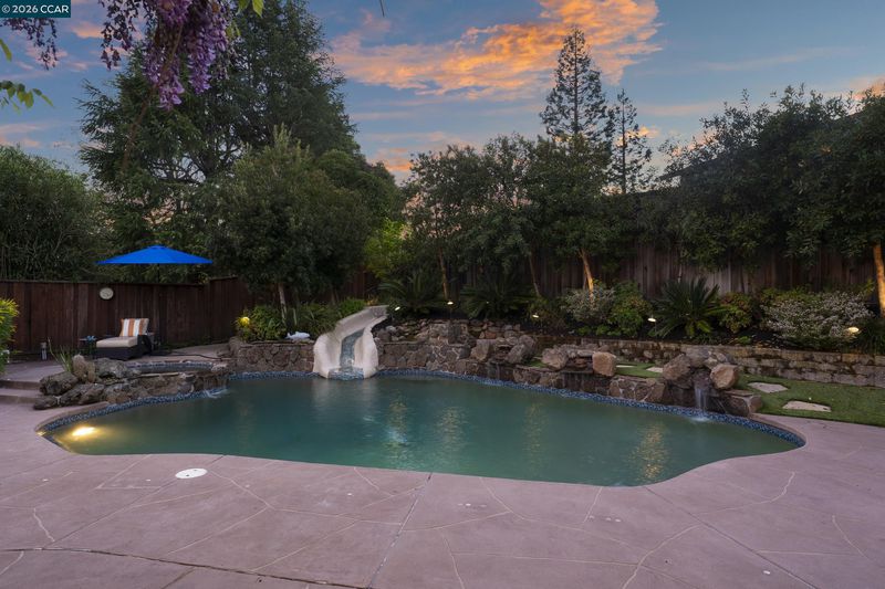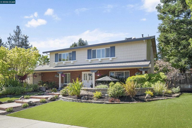 Paradise in your own backyard! Sparkling pool & spa with fountains & slide sit adjacent to a serene koi pond with covered wooden bridge giving a resort feel to this private oasis. Beautifully maintained home offers spacious everyday living and wonderful opportunities for entertaining. Main level bedroom is perfect for private home office and/or guest room. Formal living room & dining room offer rich wooden flooring with french doors to garden. Light & bright kitchen flows seamlessly into breakfast nook & family room with newly renovated custom cabinet wet bar & cozy gas fireplace. Follow the brand new carpeting upstairs to two more large secondary bedrooms with remodeled bathroom as well as a luxurious primary suite boasting a sitting area potentially for a second office space and spectacular ensuite bathroom with huge walk-in shower, relaxing soaking tub, and his & her's closets you have to see to believe! This house has solar with a Tesla battery, oversized garage with work bench & storage, and a recently installed new roof. Located in the award-winning SRV School District, it is just moments from Bollinger Elementary School, shopping, restaurants & easy freeway access.
