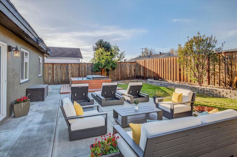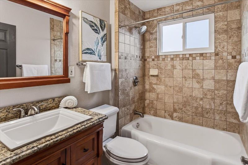 The spacious kitchen is a dream, boasting granite counters, stainless steel appliance, including an oversized Kenmore Elite 5-burner gas stove and oven and a Miele dishwasher less than a year old, and a breakfast nook with ample cabinetry.The updated bathroom features a granite counter vanity, and a shower-over-tub with tile surround. Open living and dining areas with backyard access. Prized upgrades include central air conditioning, large dual pane windows, hardwood floors, brand new hot water heater, fireplace in the living room, and ceiling fans in the bedrooms. Relax in the hot tub and enjoy the large backyard with mature landscaping. The finished shed with heating and cooling offers a wonderful, flexible-use space. Great house and yard for entertainment!One bedroom has been adapted into a deluxe closet and dressing room with built-in storage window seat, and an island-style dresser (not attached).Convenient location close to commute routes (including Lower Silver Creek Trail and VTA lightrail), shopping, and dining.Washer, dryer, and fridge included. Outside furniture may stay if desired (both front porch and backyard furniture).